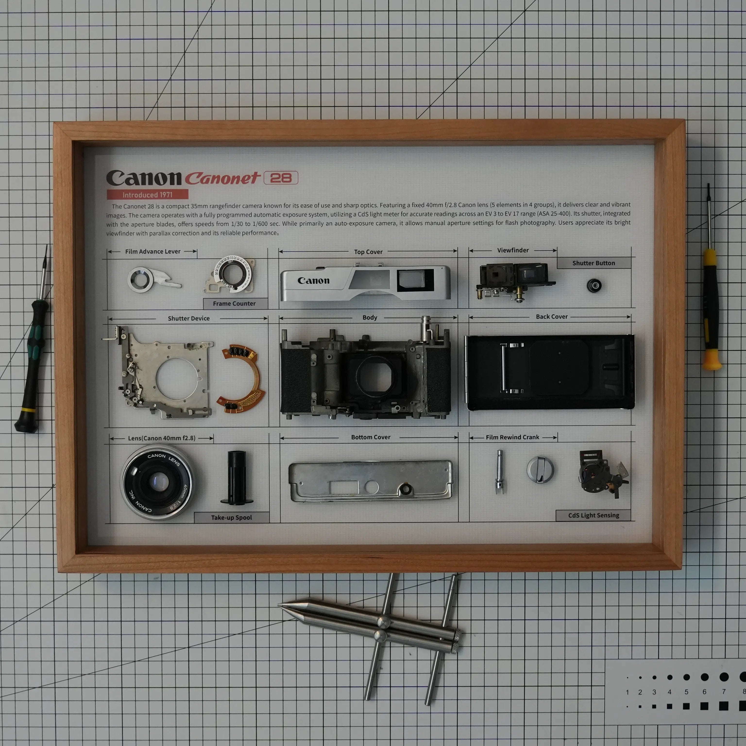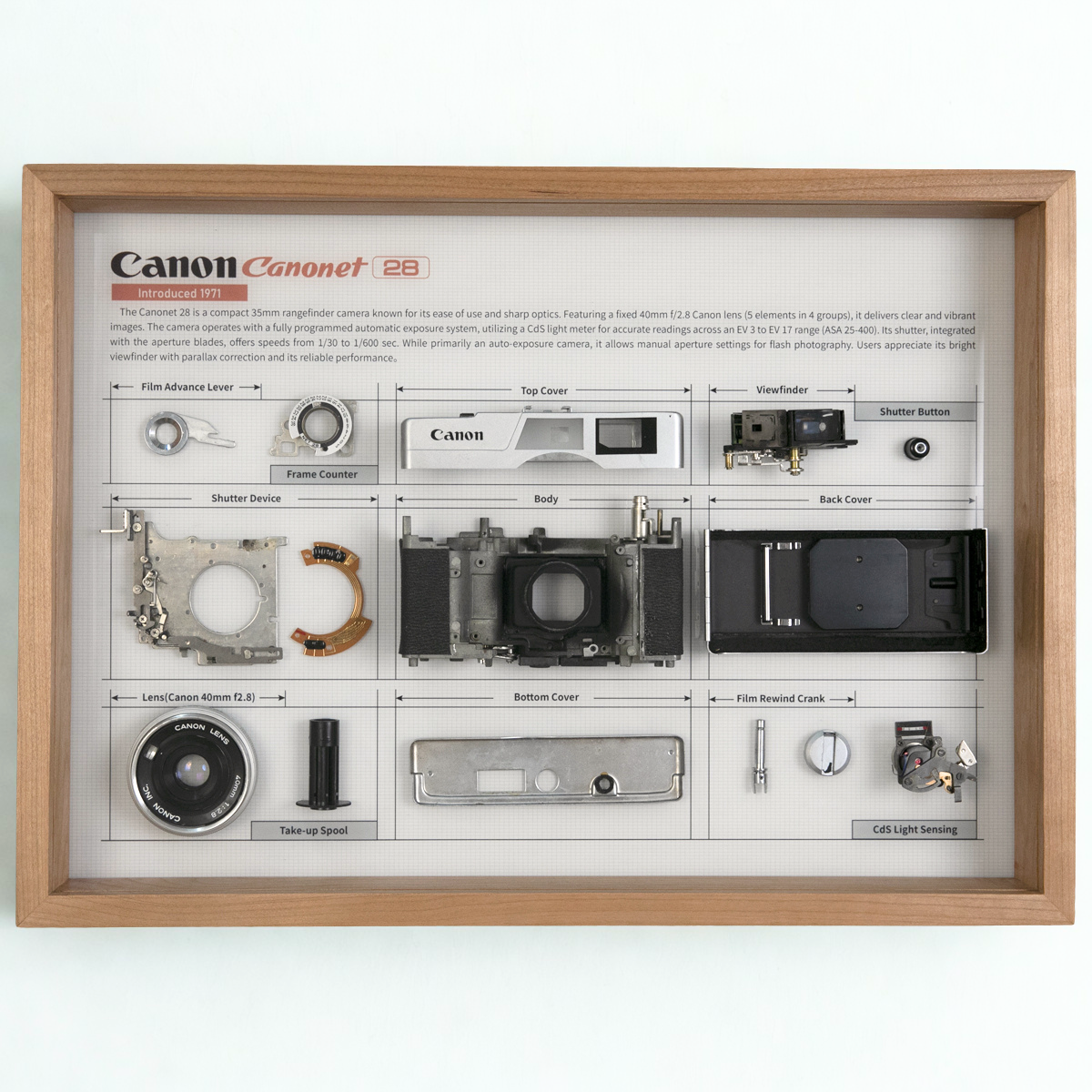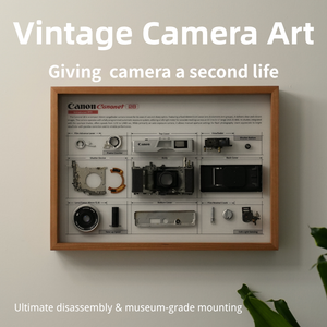 This is a unique, handcrafted piece of vintage camera art. We believe that even when old cameras can no longer take pictures, their internal mechanical aesthetics deserve to be admired. We take an authentic vintage camera, fully disassemble it, and then redesign and lay out its most fascinating components, permanently framing them into a tangible piece of industrial art. It serves as both a stylish piece of wall art and a unique gift for photography lovers or geek friends.